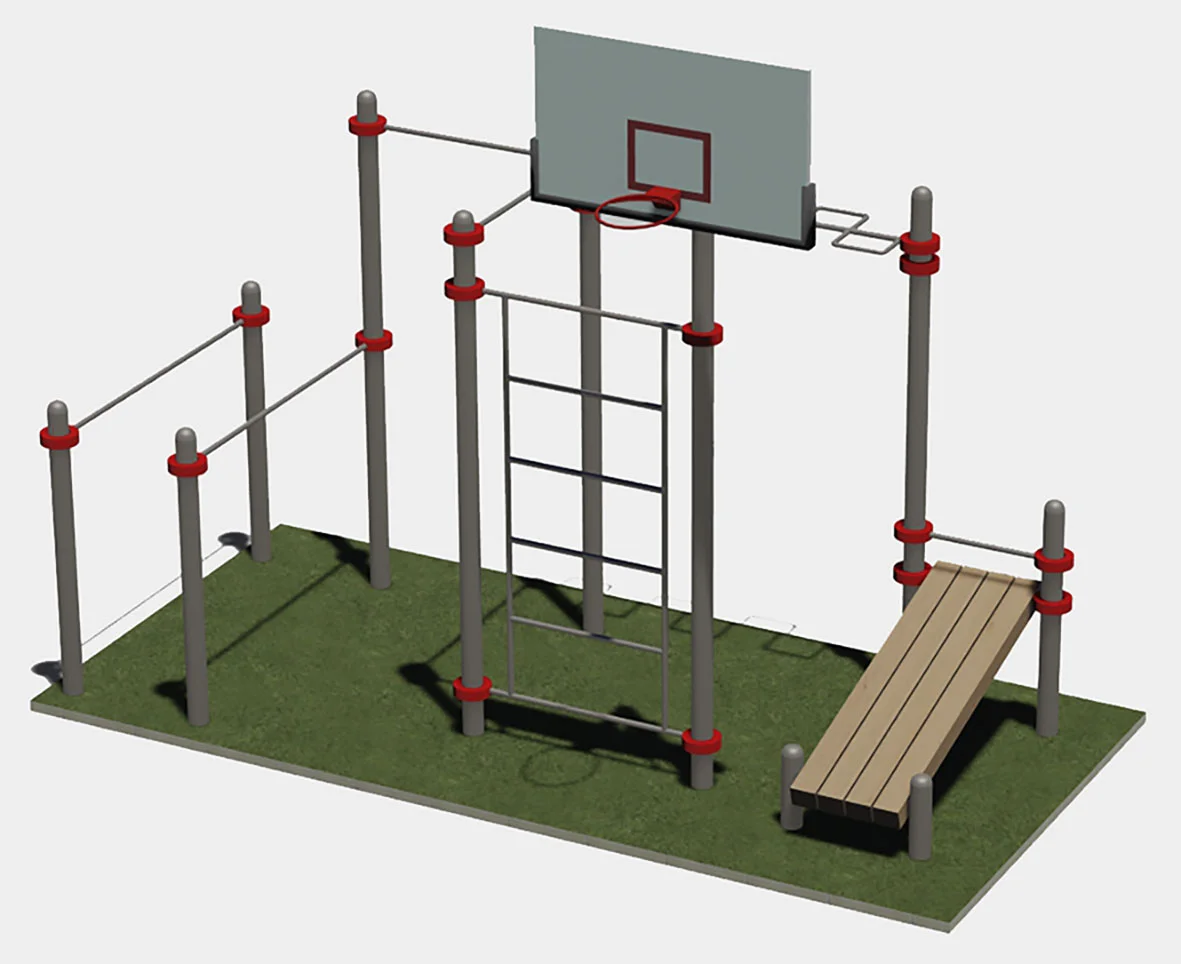 Два турника, брусья, шведская стенка, змеевик, скамья для пресса и баскетбольный щит