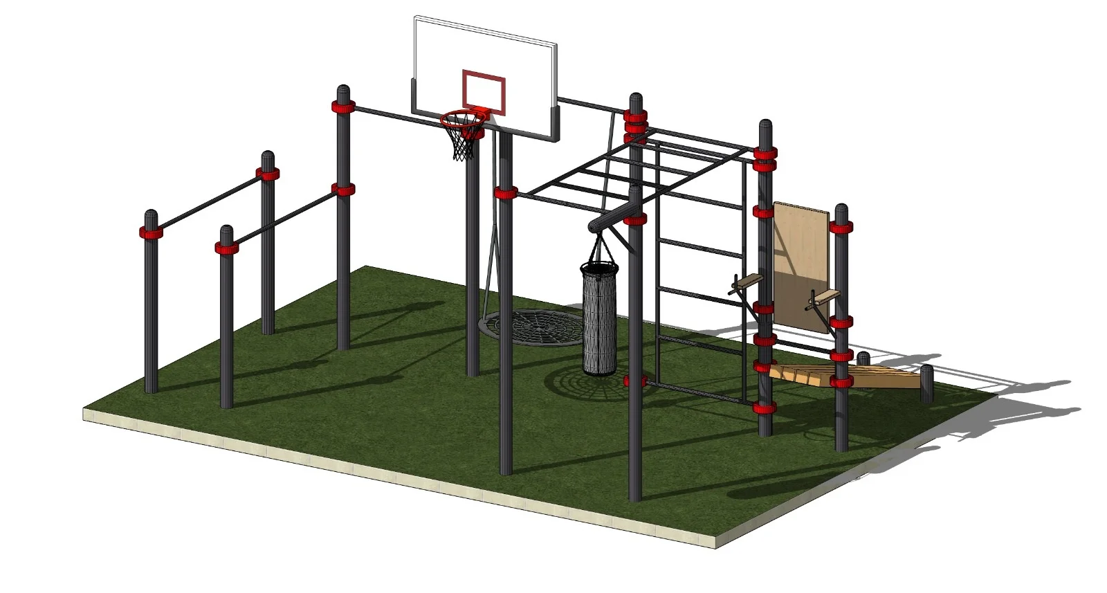 Турник классический, брусья, шведская стенка, скамья для пресса, вертикальный пресс, баскетбольный щит, качели и вынос для боксерской груши