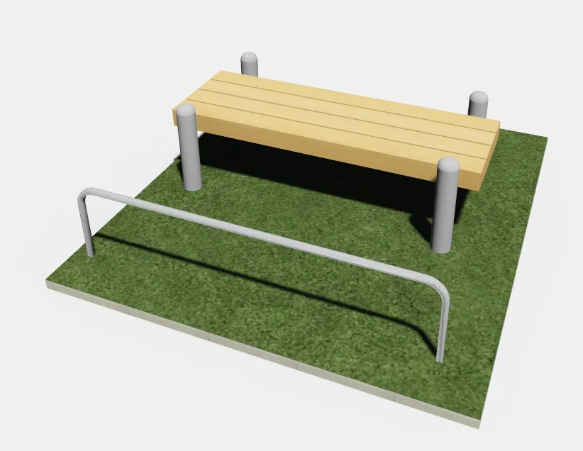 Составляющими скамьи являются: деревянный брус сечением 140*50мм и металлический каркас. Крепеж деревянного сидения осуществляется полухомутами к горизонтальным перекладинам металлического каркаса. Усилителем конструкции является жердь, идущая по всей длине лавки.